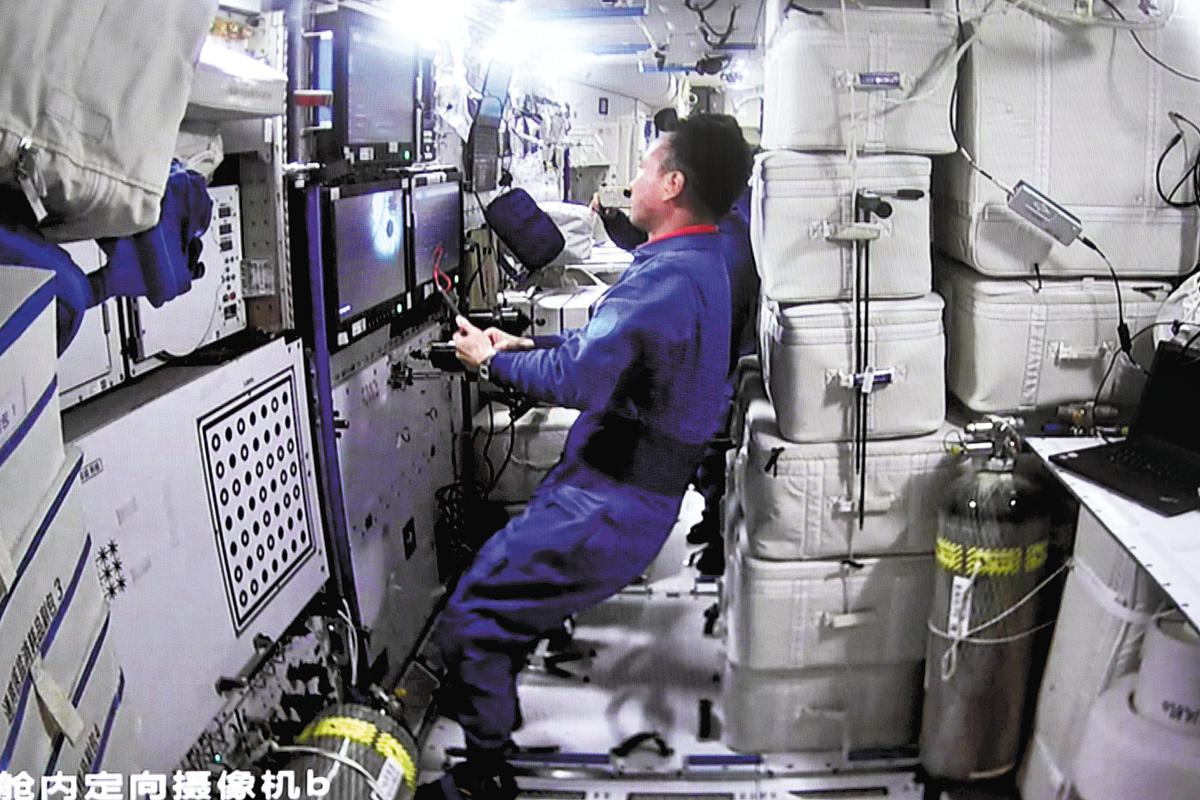 A screen grab from the Beijing Aerospace Control Center shows an astronaut working inside the Tianhe core module of the orbiting Tiangong space station after the Tianzhou 6 cargo craft docked with the station at 5:16 am on Thursday. The cargo craft was launched at 9:22 pm on Wednesday from the Wenchang Spacecraft Launch Site in Hainan province. [Photo/Xinhua]