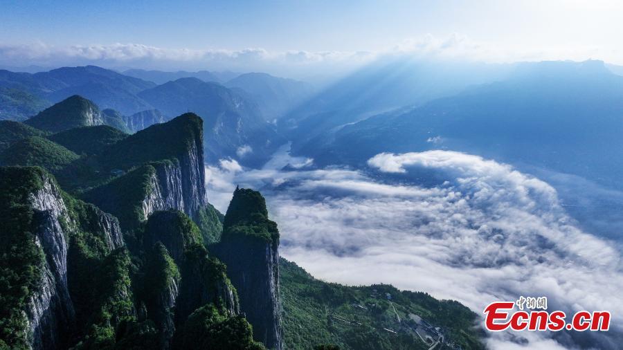 Dense clouds fill the Enshi Grand Canyon in central China's Hubei Province. The Enshi Grand Canyon is a typical karst landscape, with cliffs, caves, rock pillars, subsurface streams and waterfalls. (Photo: China News Service/Zhang Yuanming)