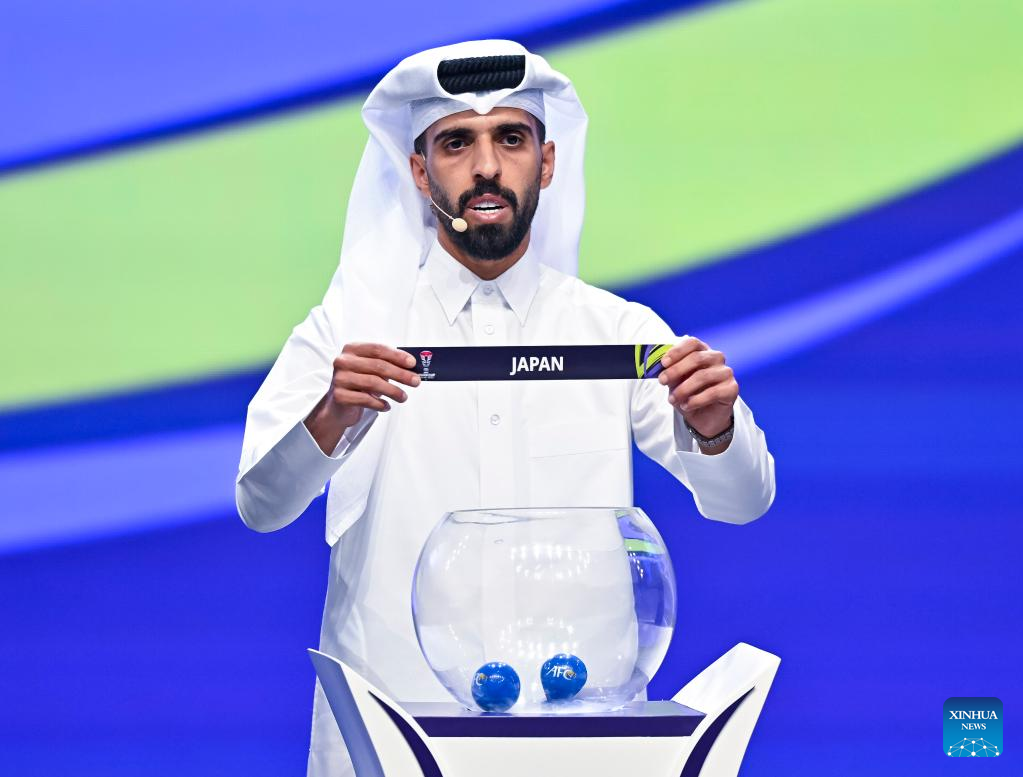 Qatari footballer Hassan al-Haydos displays the slip of team Japan during the draw ceremony for the 2023 AFC Asian cup championship held in Doha, Qatar on May 11, 2023. (Photo by Nikku/Xinhua)