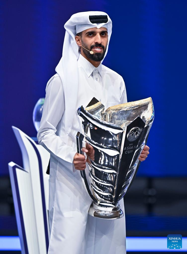 Qatari footballer Hassan al-Haydos carries the Asian Cup trophy during the draw ceremony for the 2023 AFC Asian cup championship held in Doha, Qatar on May 11, 2023. (Photo by Nikku/Xinhua)