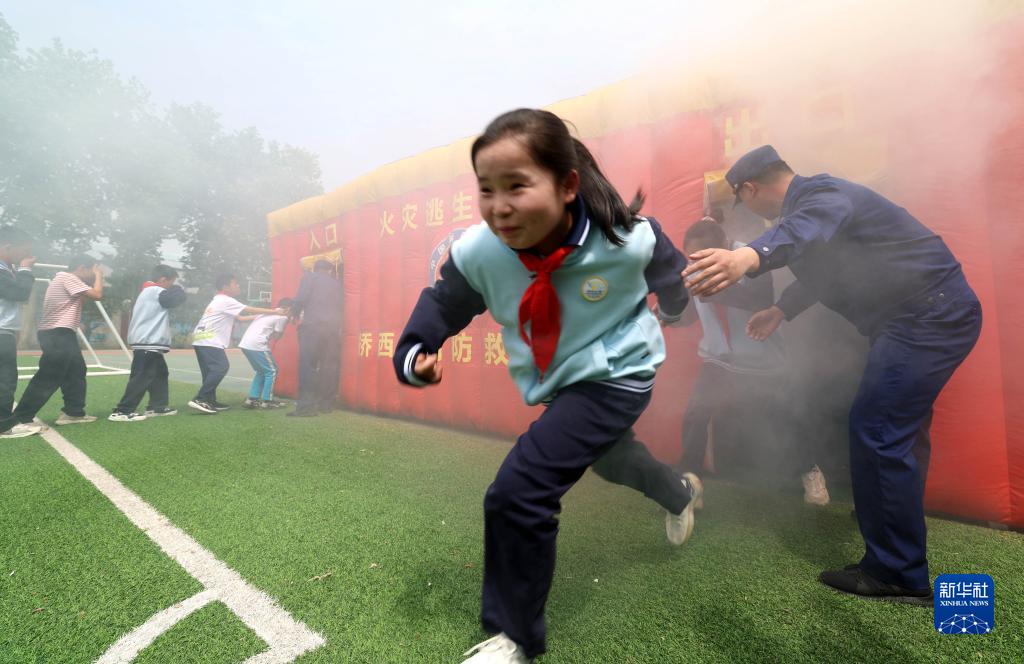 Elementary students take part in a fire escape drill under the guidance of firefighters in Shijiazhuang, north China's Hebei Province, May 10, 2023.?(Photo by Liang Zidong/Xinhua)