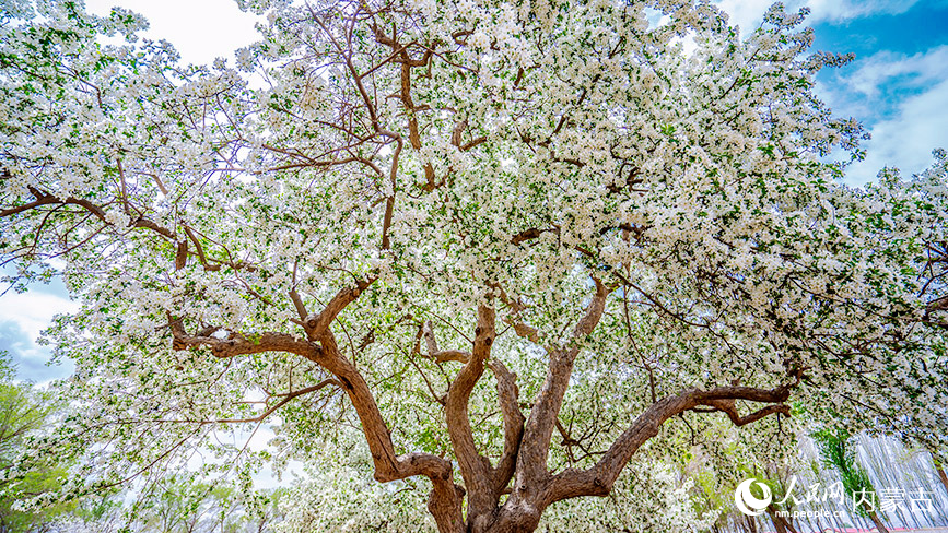 Photo shows a century-old crabapple tree blossoming at the foot of the Yin Mountains in Urad Rear Banner, north China's Inner Mongolia Autonomous Region. (Photo/People's Daily Online)