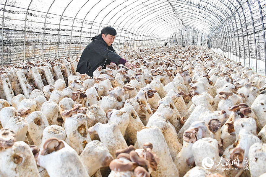 A man checks on the growth of mushrooms in Mengwa village, Zhangguang township, Chuzhou city, east China's Anhui Province. (People's Daily Online/Zhou Kun)