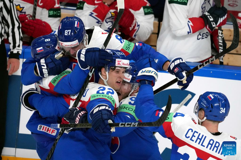 Slovakia's players celebrate scoring during the Group B match between the Czech Republic and Slovakia at the 2023 IIHF Ice Hockey World Championship in Riga, Latvia, May 12, 2023. (Photo by Edijs Palens/Xinhua)