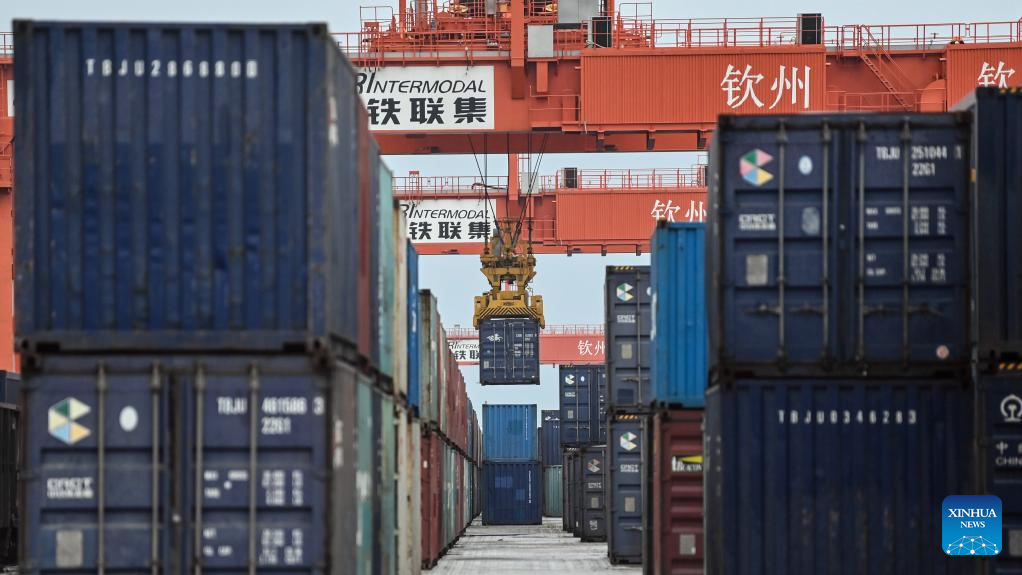 A crane unloads containers at a railway container distribution center in Qinzhou City, south China's Guangxi Zhuang Autonomous Region, May 11, 2023. With boosts from the Regional Comprehensive Economic Partnership (RCEP) and the Belt and Road Initiative (BRI), the New International Land-Sea Trade Corridor saw over 300,000 twenty-foot equivalent units (TEUs), an increase of 14 percent year-on-year, being transported by the rail-sea intermodal freight trains this year. At present, over 940 kinds of goods can be transported through the New International Land-Sea Trade Corridor, which covers 61 cities in China and reaches 393 ports in 119 countries and regions. (Xinhua/Zhang Ailin)