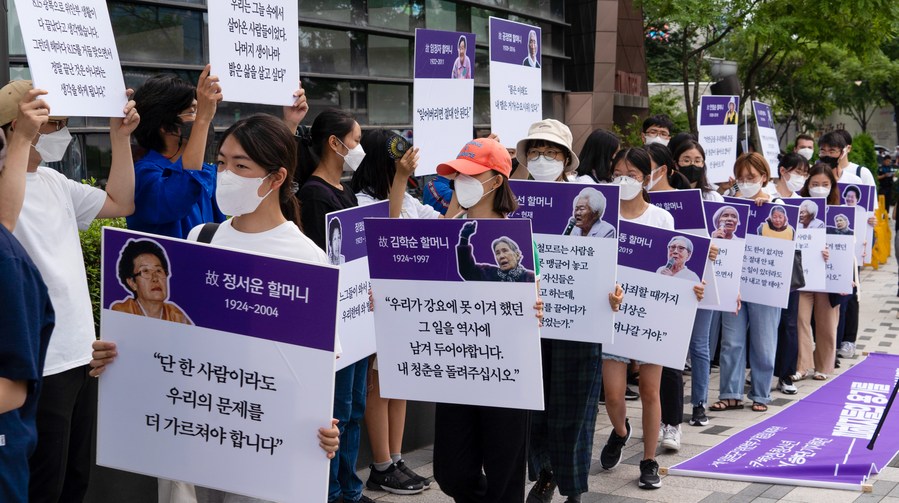 People hold portraits of "comfort women" and their testimonies during a protest rally held in Seoul, South Korea, Aug. 14, 2022. (Photo by James Lee/Xinhua)