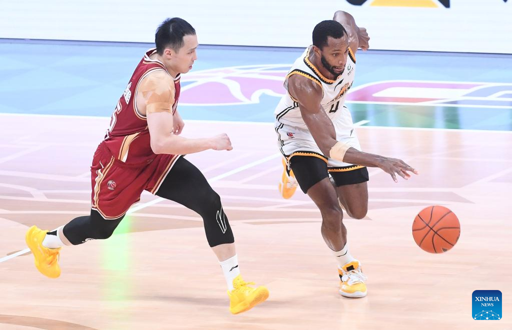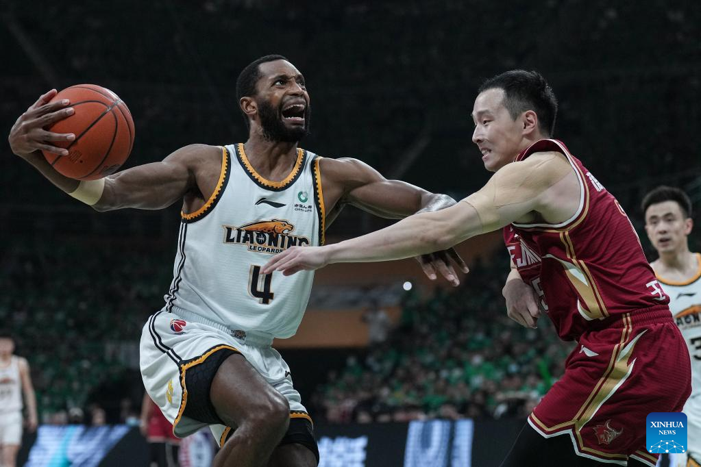 Kyle Fogg (L) of Liaoning Flying Leopards competes during the fourth round final match between Liaoning Flying Leopards and Zhejiang Golden Bulls at the Chinese Basketball Association (CBA) league 2022-2023 season playoffs, in Shenyang, north China's Liaoning Province, May 15, 2023. (Xinhua/Pan Yulong)