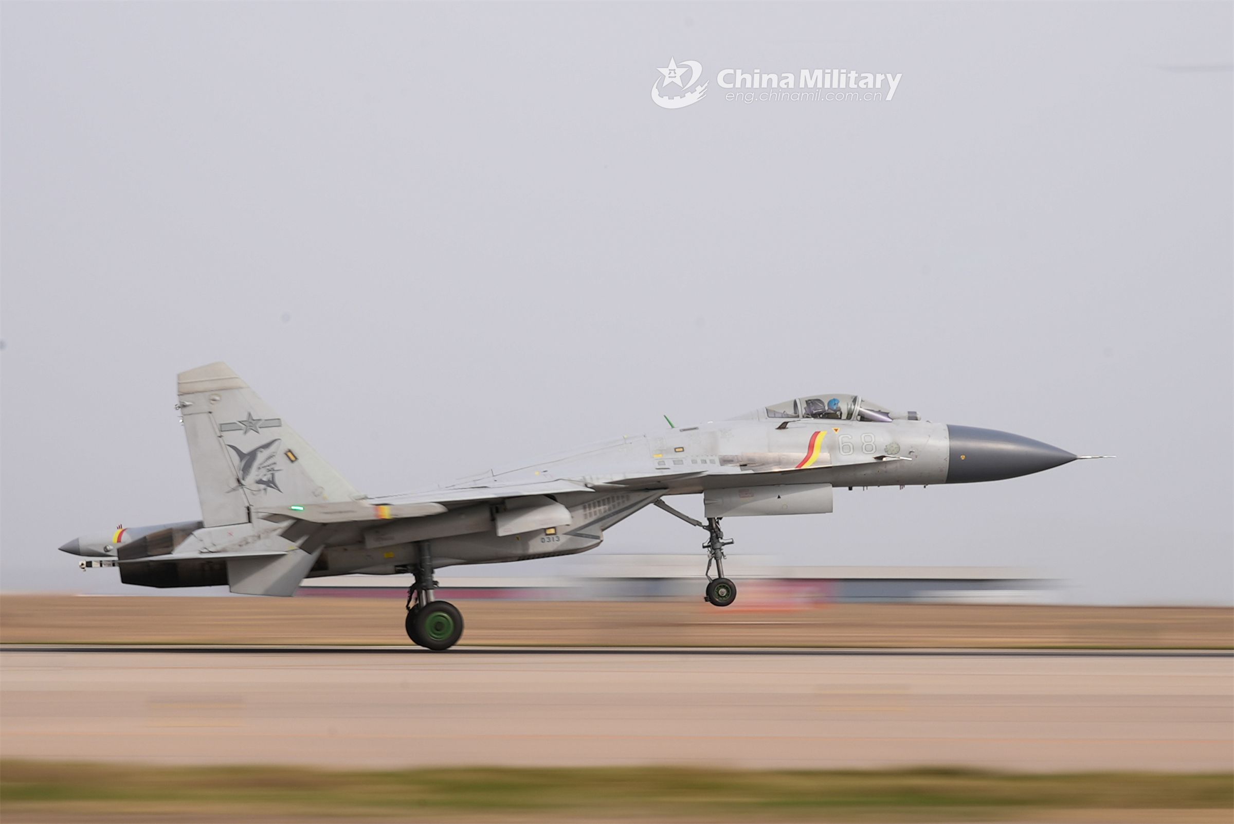 A fighter jet attached to a regiment under the PLA Naval Aviation University speeds up to take off during the round-the-clock flight training recently. (eng.chinamil.com.cn/Photo by Ni Shuai)