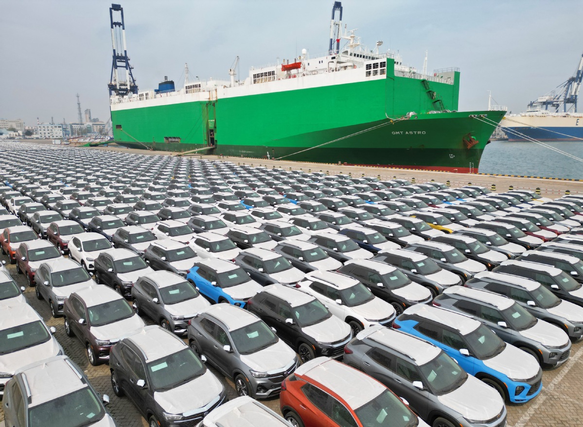 Cars for export wait to be loaded at Yantai Port in Yantai, Shandong province, on April 3. [PHOTO by TANG KE/FOR CHINA DAILY]