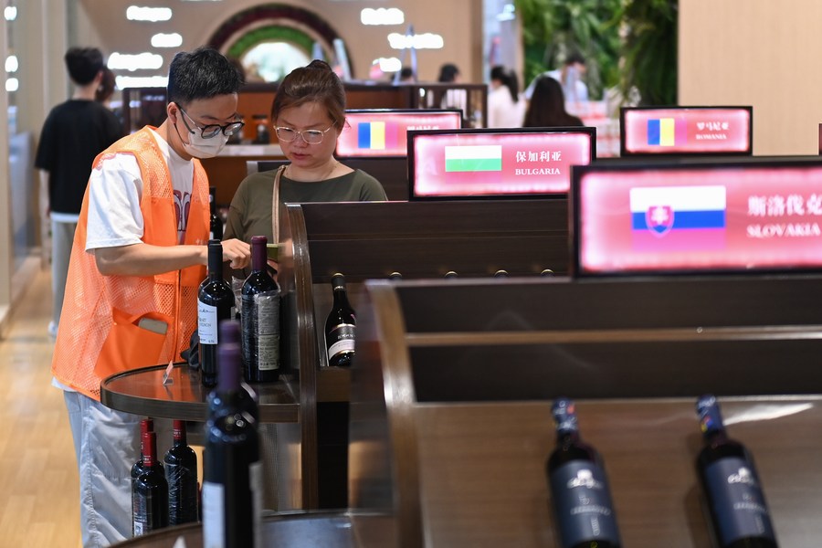 A visitor selects wine at the China-Central & Eastern European Countries (CEEC) Expo in Ningbo, east China's Zhejiang Province, May 16, 2023. (Xinhua/Huang Zongzhi)