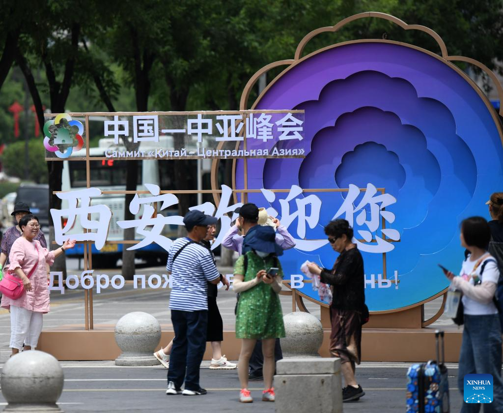 Tourists take photos with an installation of the China-Central Asia Summit in Xi'an, northwest China's Shaanxi Province, May 16, 2023. The China-Central Asia Summit is set to take place in Xi'an, the capital city of China's Shaanxi Province, on May 18 and 19. (Xinhua/Li Yibo)
