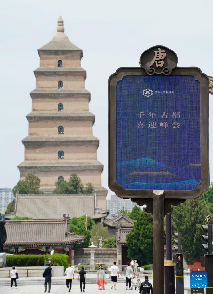 This photo taken on May 16, 2023 shows an installation of the China-Central Asia Summit in Xi'an, northwest China's Shaanxi Province. The China-Central Asia Summit is set to take place in Xi'an, the capital city of China's Shaanxi Province, on May 18 and 19. (Xinhua/Li Jing)
