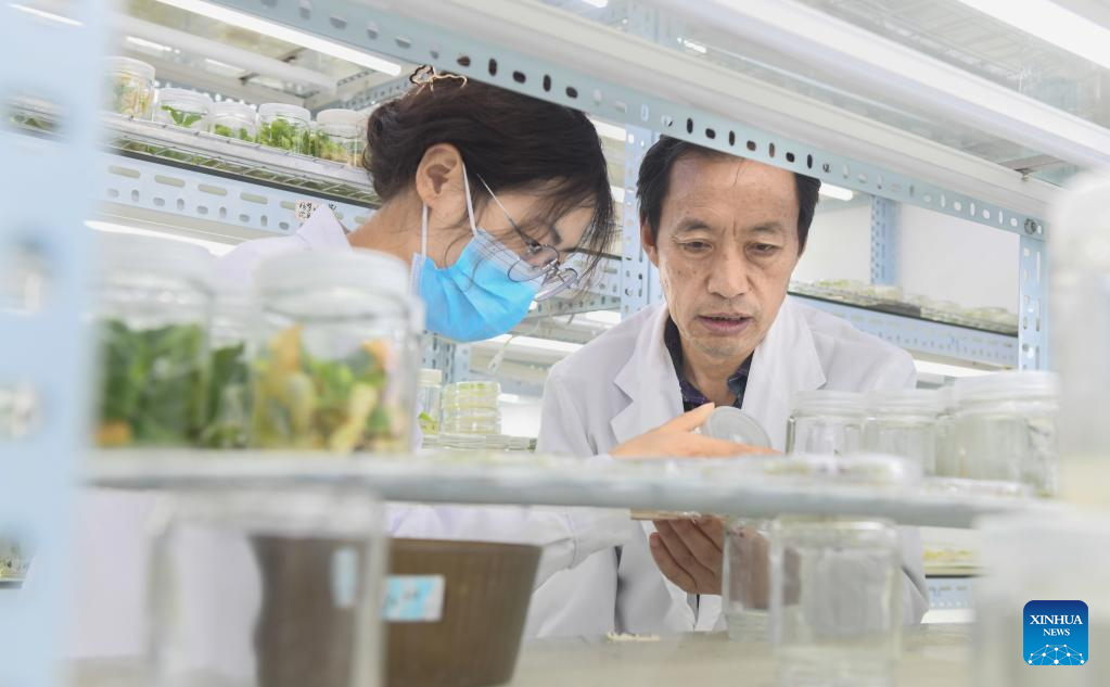 Bao Manzhu (R), a professor of forestry, works with a student at a laboratory in Wuhan, capital of central China's Hubei Province, May 5, 2023. (Xinhua/Cheng Min)