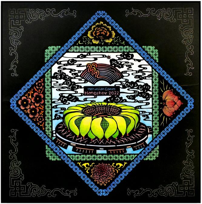 The "Big Lotus" (Hangzhou Olympic Sports Center Stadium) is central to the paper-cutting called Welcome to the Asian Games, along with the logo of the Games and propitious clouds. [Photo provided to chinadaily.com.cn]