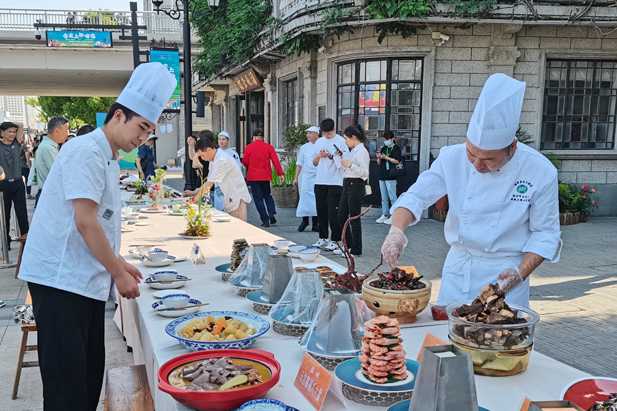 Local chefs prepare Zhejiang cuisine at a culinary event at Laowaitan, a signature pedestrian street in Ningbo, east China's Zhejiang Province, May 15, 2023. Featuring a long table banquet, the food fiesta brings the participants a public display of delicacies from Central and Eastern European Countries (CEECs) and Zhejiang Province as well. The culinary event, held on the sidelines of the ongoing third China-CEEC Expo &International Consumer Goods Fair, will run until May 18. (Xinhuanet/Zhang Qian)