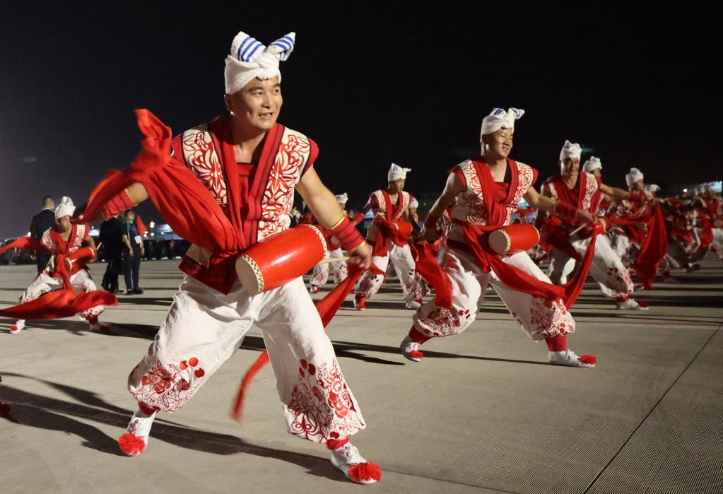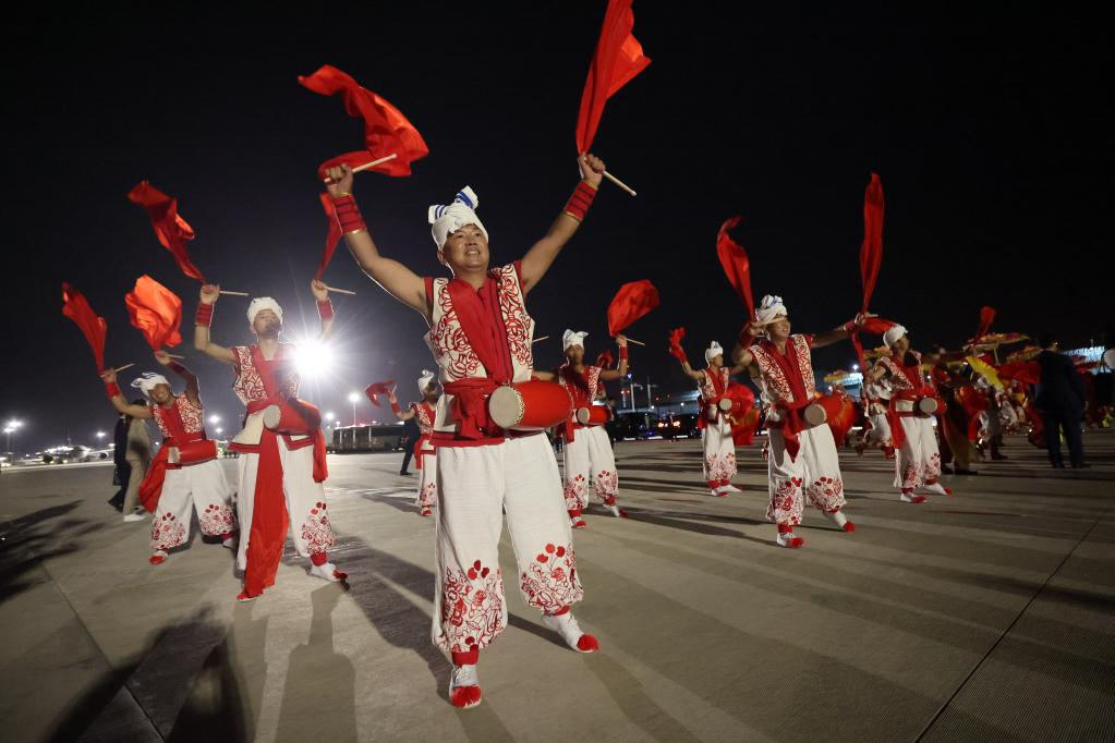 Shaanxi folk dancers perform during a welcoming ceremony for Uzbek President Shavkat Mirziyoyev in Xi'an, northwest China's Shaanxi Province, May 18, 2023. Uzbek President Shavkat Mirziyoyev arrived early Thursday in Xi'an, northwest China's Shaanxi Province, to attend the China-Central Asia Summit, which is scheduled for Thursday and Friday. (Xinhua/Xing Guangli)
