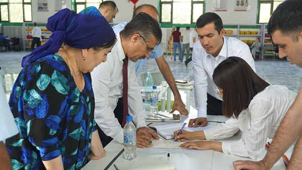 Teachers of the Luban Workshop in Tajikistan have a discussion on lecturing. (Photo courtesy of Tianjin Urban Construction Management and Vocation Technology College)