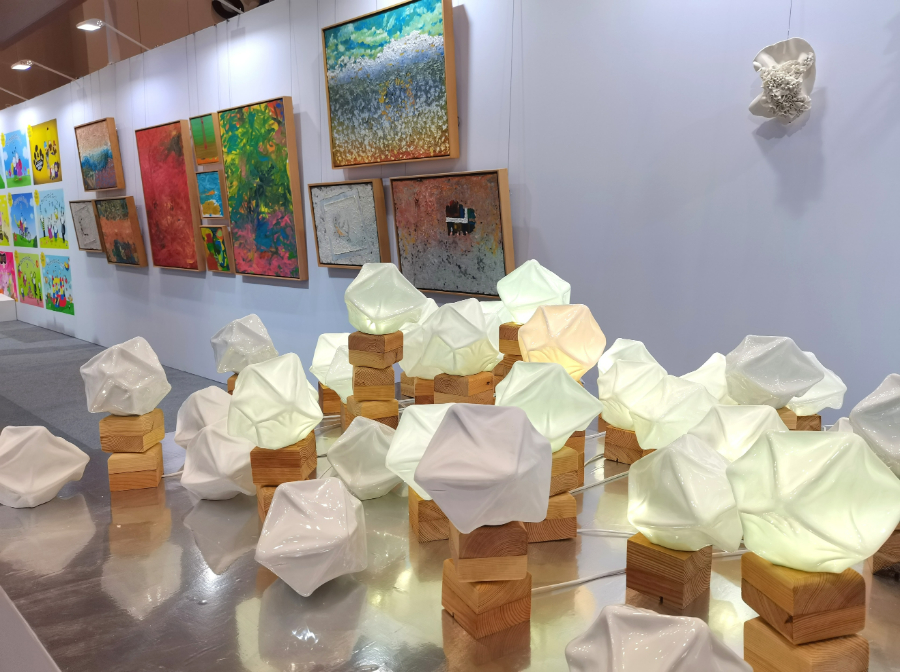 This photo taken on May 16, 2023 shows art works on display at the China-Central & Eastern European Countries (CEEC) Expo in Ningbo, east China's Zhejiang Province. Distinctive commodities from Central and Eastern European countries, especially agricultural food, wines, and dairy products, have drawn wide attention at the expo. (Xinhuanet/Zhang Qian)