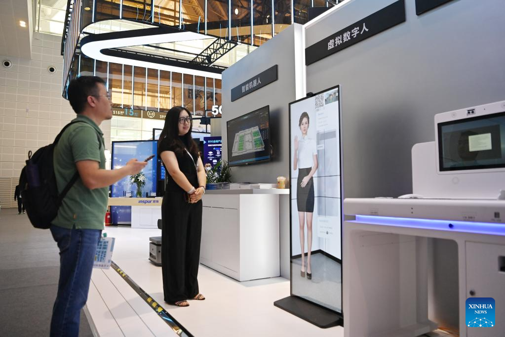 A man visits an intelligent technology exhibition during the seventh World Intelligence Congress (WIC) in north China's Tianjin, May 18, 2023. The seventh WIC, a major AI event in China, kicked off in the northern Tianjin Municipality on Thursday. (Xinhua/Li Ran)