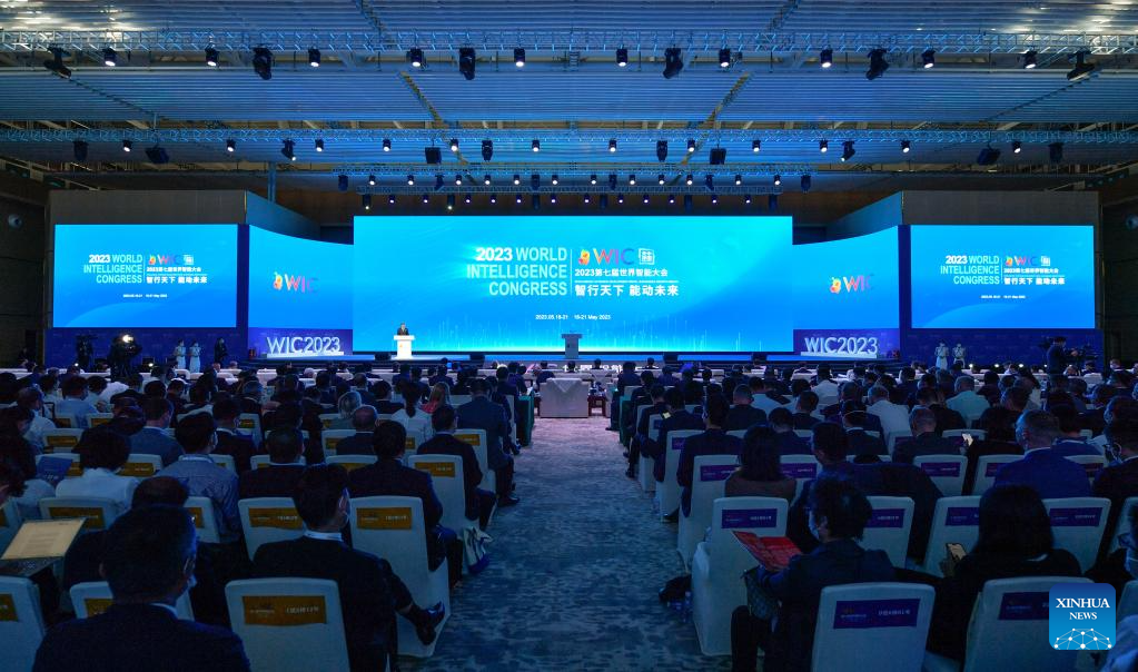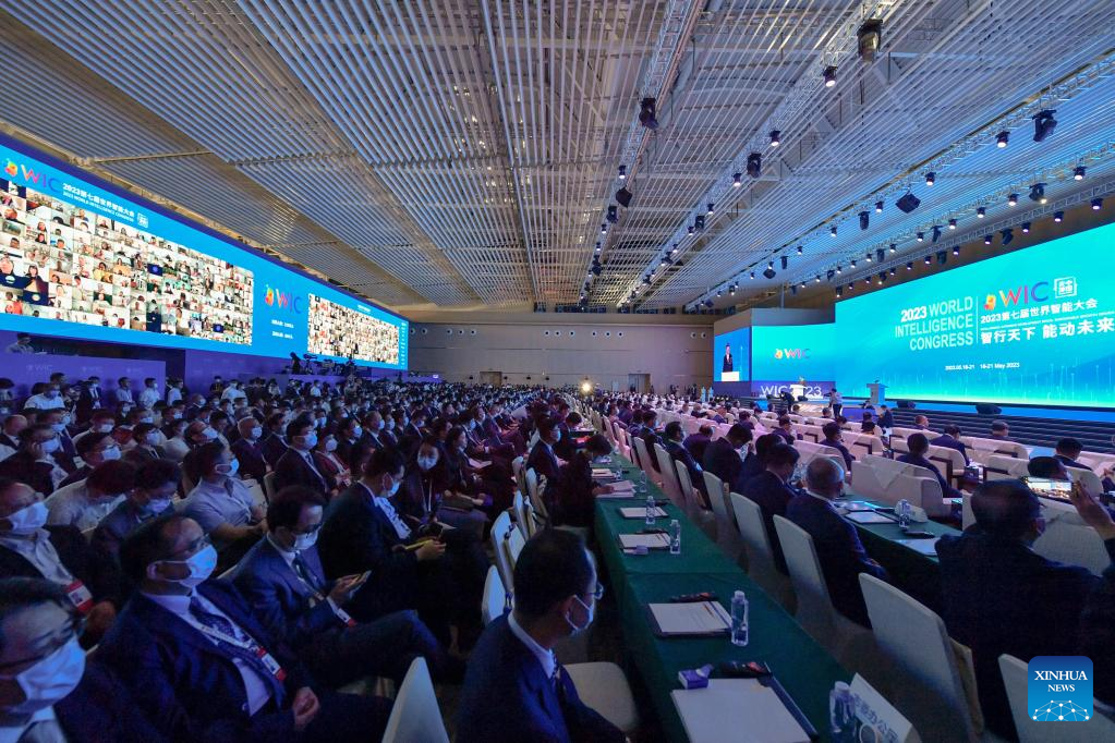 This photo taken on May 18, 2023 shows the opening ceremony of the seventh World Intelligence Congress (WIC) in north China's Tianjin. The seventh WIC, a major AI event in China, kicked off in the northern Tianjin Municipality on Thursday. (Xinhua/Sun Fanyue)