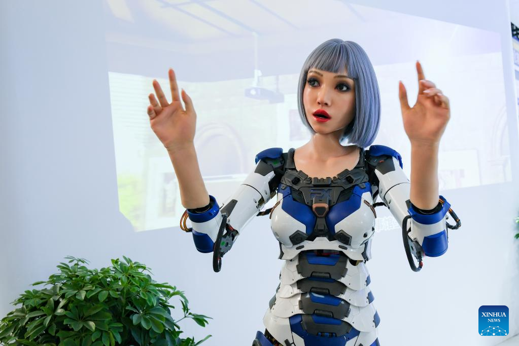 A bionic robot is pictured at an intelligent technology exhibition during the seventh World Intelligence Congress (WIC) in north China's Tianjin, May 18, 2023. The seventh WIC, a major AI event in China, kicked off in the northern Tianjin Municipality on Thursday. (Xinhua/Zhang Cheng)