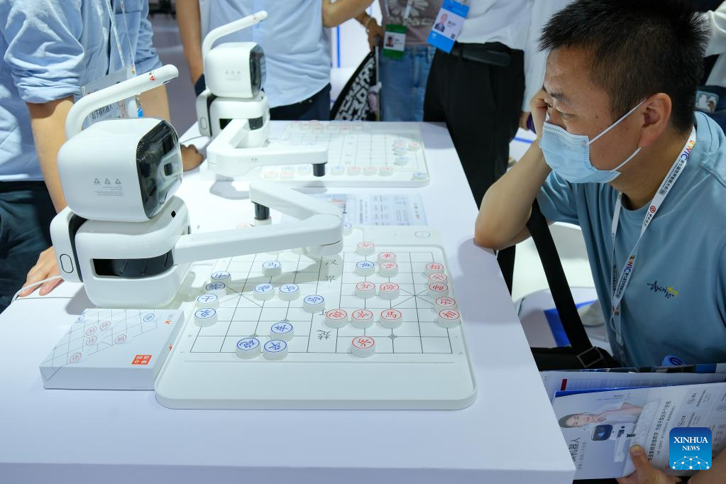 A visitor plays Chinese chess with an artificial intelligence (AI) robot at an intelligent technology exhibition during the seventh World Intelligence Congress (WIC) in north China's Tianjin, May 18, 2023. The seventh WIC, a major AI event in China, kicked off in the northern Tianjin Municipality on Thursday. (Xinhua/Zhang Cheng)