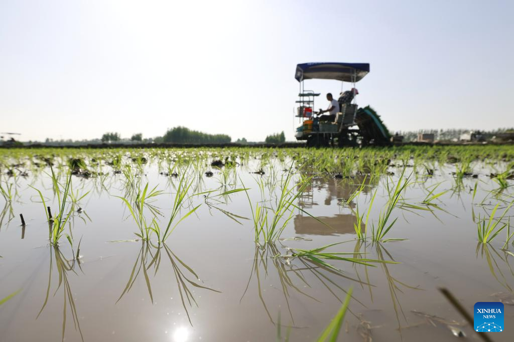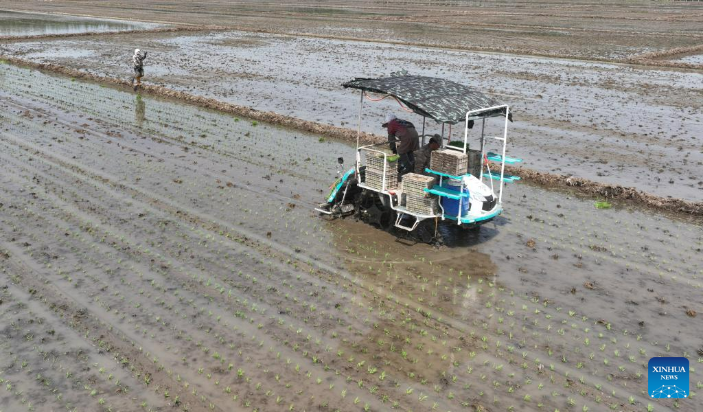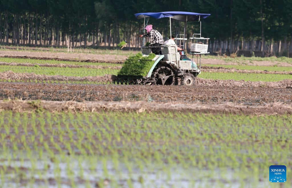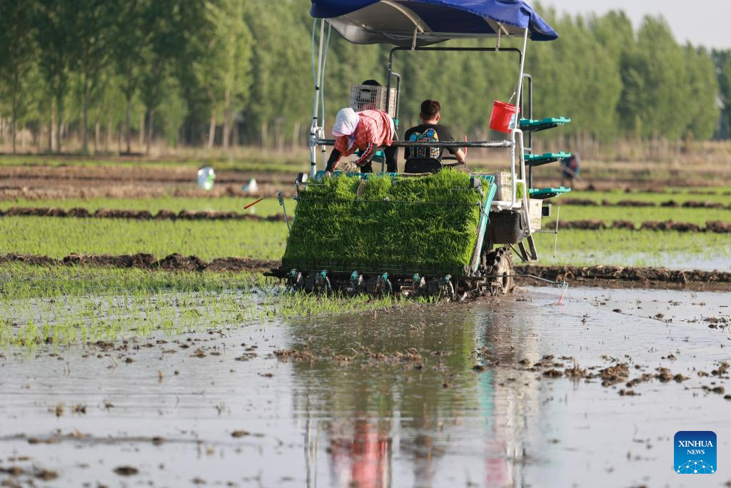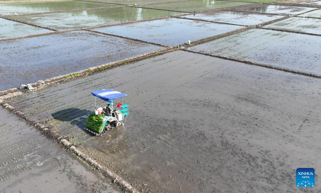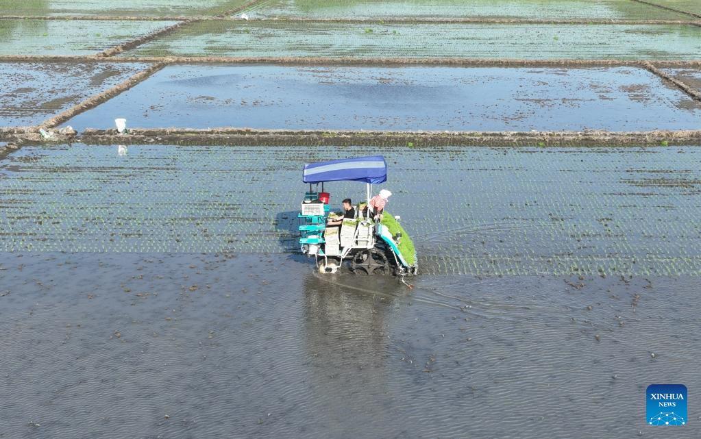This photo taken on May 18, 2023 shows farmers driving an agricultural vehicle to transplant seedlings of rice in fields of Chahe Town in Fengnan District of Tangshan city, north China's Hebei Province. Fengnan District is expected to sow 130,000 mu (8666.7 hectares) of rice this year. (Xinhua/Zhu Xudong)