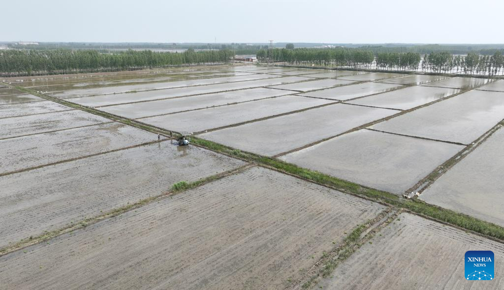 This aerial photo taken on May 18, 2023 shows farmers driving an agricultural vehicle to transplant seedlings of rice in fields of Chahe Town in Fengnan District of Tangshan city, north China's Hebei Province. Fengnan District is expected to sow 130,000 mu (8666.7 hectares) of rice this year. (Xinhua/Zhu Xudong)