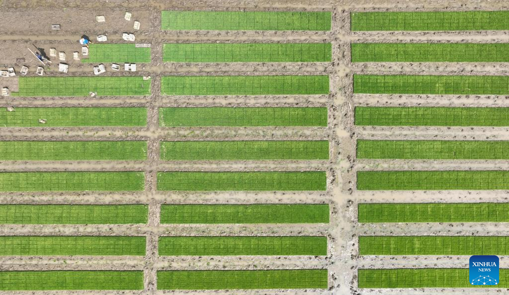 This aerial photo taken on May 18, 2023 shows farmers preparing to transplant seedlings of rice in fields of Chahe Town in Fengnan District of Tangshan city, north China's Hebei Province. Fengnan District is expected to sow 130,000 mu (8666.7 hectares) of rice this year. (Xinhua/Zhu Xudong)