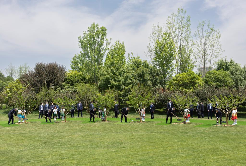 Chinese President Xi Jinping and leaders of five Central Asian countries plant six pomegranate trees that represent close China-Central Asia solidarity and cooperation after the first China-Central Asia Summit in Xi'an, northwest China's Shaanxi Province, May 19, 2023. Xi chaired the first China-Central Asia Summit and delivered a keynote speech themed "Working Together for a China-Central Asia Community with a Shared Future Featuring Mutual Assistance, Common Development, Universal Security, and Everlasting Friendship" at the summit here on Friday. (Xinhua/Ding Haitao)