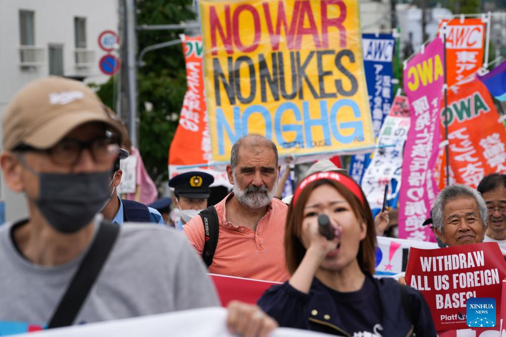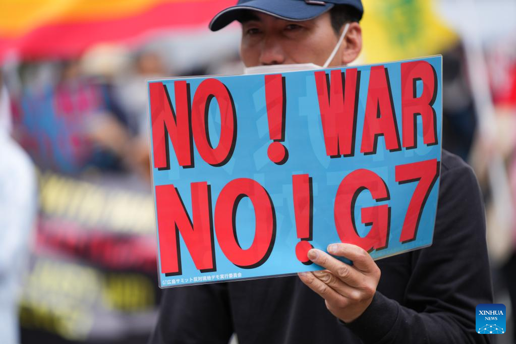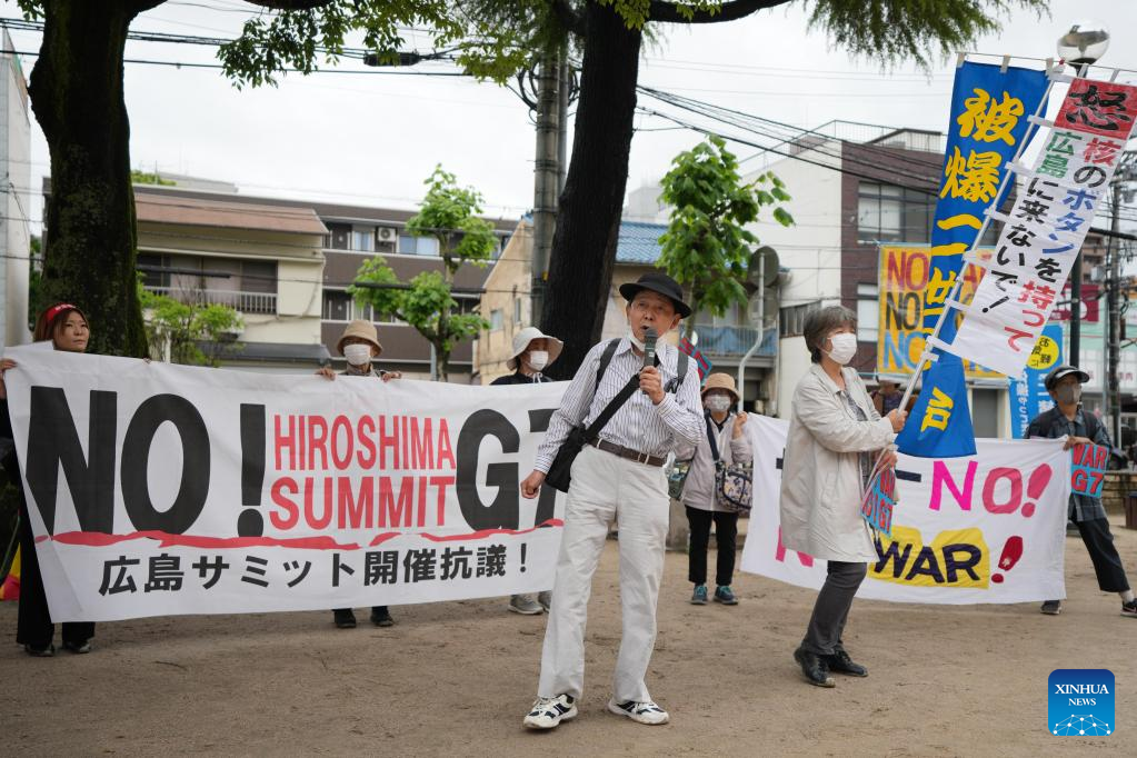 People rally in a protest against the Group of Seven (G7) summit in Hiroshima, Japan, May 19, 2023. Amid waves of protests, the G7 leaders' annual summit got underway in Hiroshima on Friday. (Xinhua/Zhang Xiaoyu)