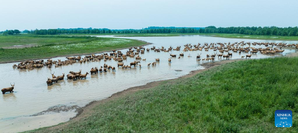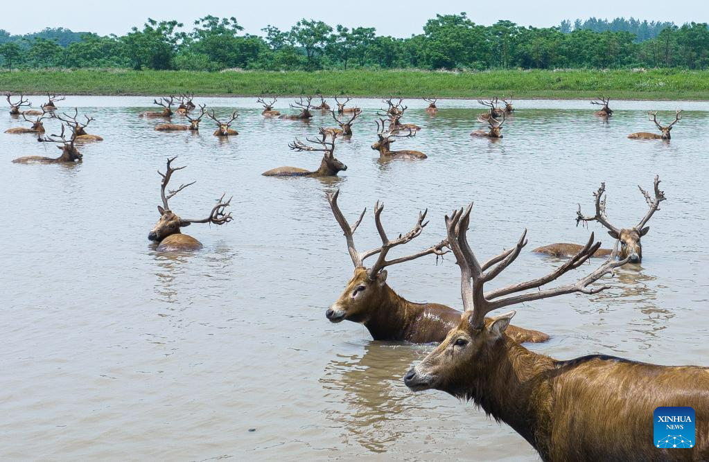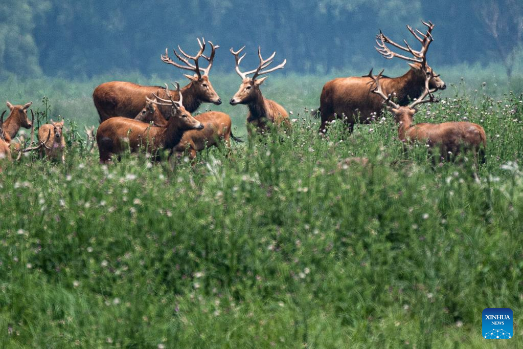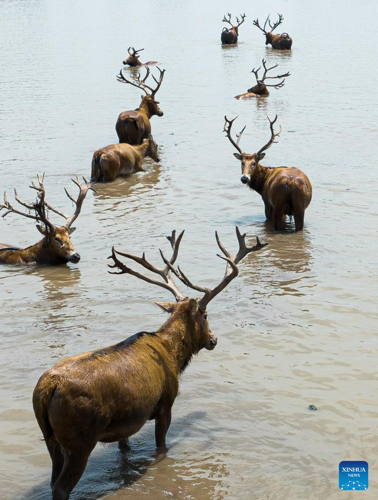 This photo taken on May 19, 2023 shows milu deer at Shishou Milu Deer National Nature Reserve in central China's Hubei Province. After years of efforts by protectors and continuous improvement of the local ecological environment, the population of milu deer at the nature reserve has increased rapidly. (Xinhua/Hui Xiaoyong)