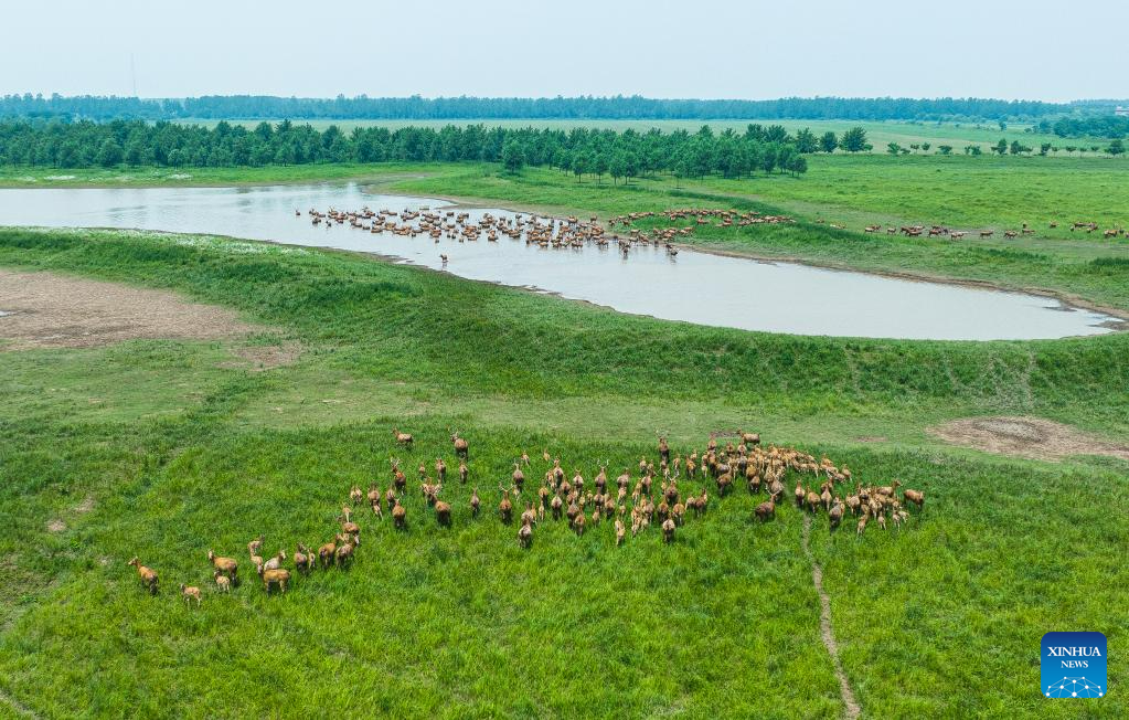 This aerial photo taken on May 19, 2023 shows milu deer at Shishou Milu Deer National Nature Reserve in central China's Hubei Province. After years of efforts by protectors and continuous improvement of the local ecological environment, the population of milu deer at the nature reserve has increased rapidly. (Xinhua/Xiao Yijiu)