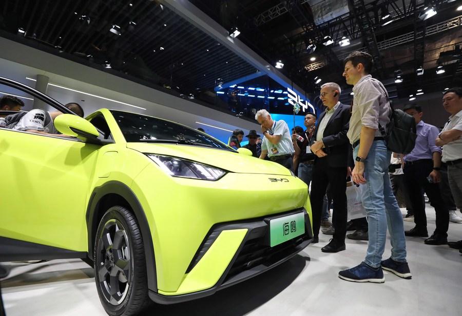 A BYD Seagull is displayed at the 20th Shanghai International Automobile Industry Exhibition in Shanghai, east China, April 18, 2023. (Xinhua/Fang Zhe)