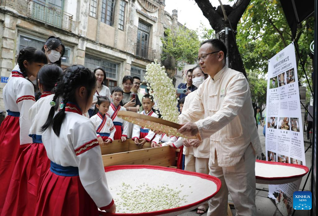 A staff member shows the making skills of Fuzhou jasmine tea during a tea culture event held in Fuzhou, southeast China's Fujian Province, May 21, 2023. May 21 marks the International Tea Day. (Xinhua/Jiang Kehong)