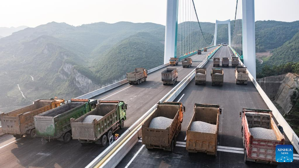 This aerial photo taken on May 21, 2023 shows the Jinfeng Wujiang River Bridge under static load testing in southwest China's Guizhou Province. Static load testing, including symmetrical and asymmetrical rounds, were conducted on the bridge Sunday. The bridge, which is 1473.5 meters in length, is a main project on the Guiyang-Jinsha-Gulin expressway. (Xinhua/Tao Liang)