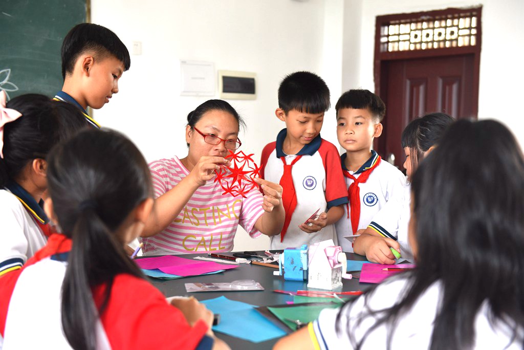 A teacher explains paper cutting to students. (Photo/Lin Xiaodan)