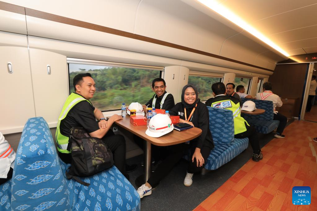 Staff members and journalists take a comprehensive inspection train during the joint commissioning and testing of the Jakarta-Bandung High-Speed Railway in Indonesia, May 22, 2023. The joint commissioning and testing of the Jakarta-Bandung High-Speed Railway (HSR) started on Monday, marking a milestone in the construction of the railway project. (Photo by Ren Weiyun/Xinhua)
