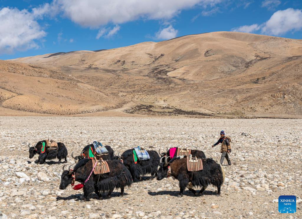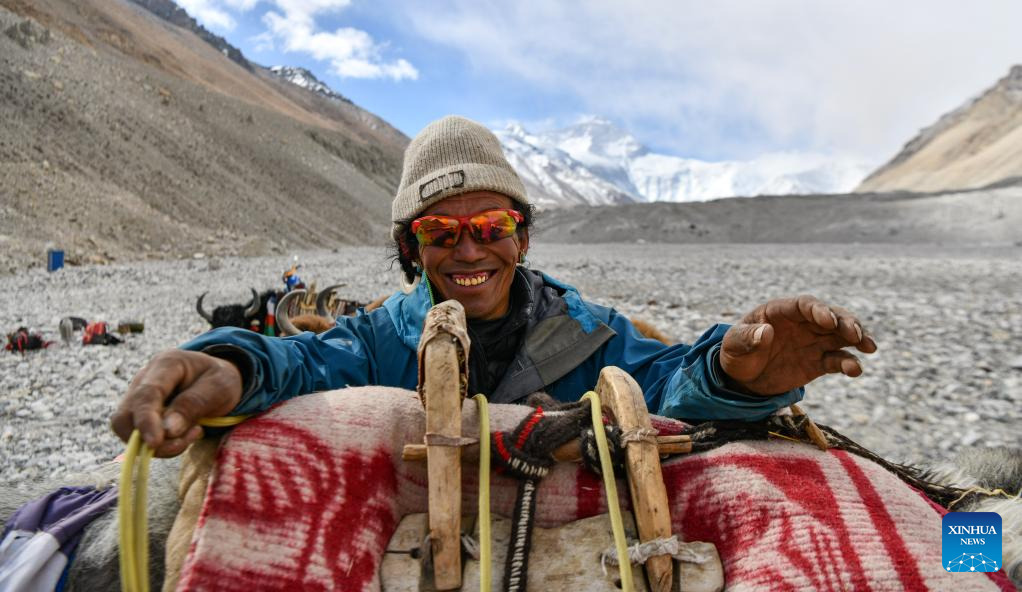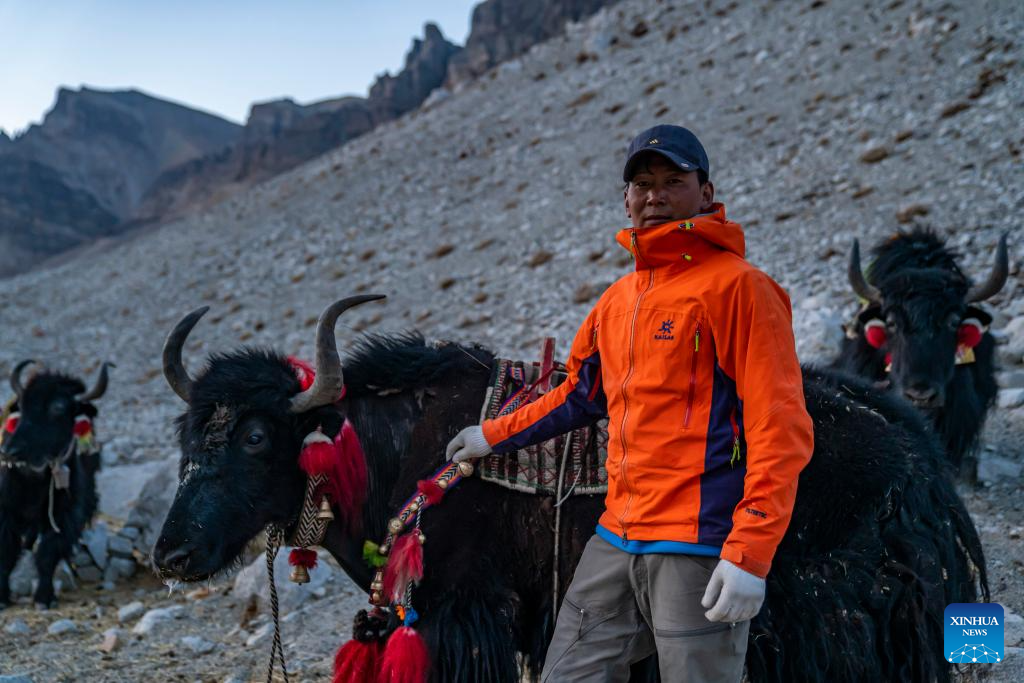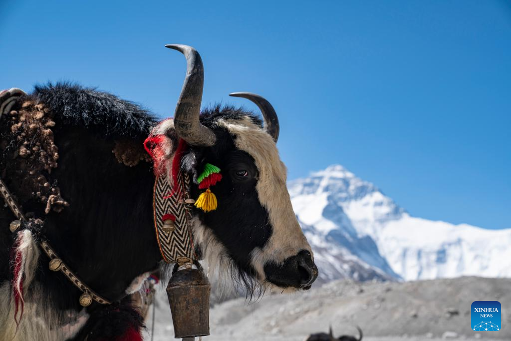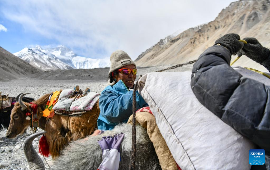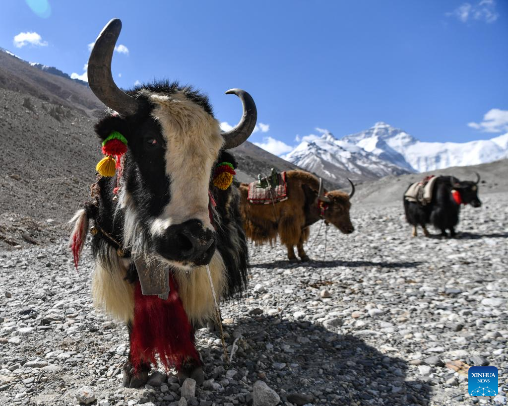 Herdsmen living in Zhaxizom Township of Tingri County, the nearest administrative township in China to Mt. Qomolangma, have been providing yak services to climbers in response to demand. The herdsmen's work of yak conveyance usually starts from walking the yaks onto the Mt. Qomolangma base camp at an altitude of 5,200 meters. Then they load these yaks with goods like oxygen cylinders and tents before heading for advance camp at an altitude of 6,500 meters on Mt. Qomolangma.
