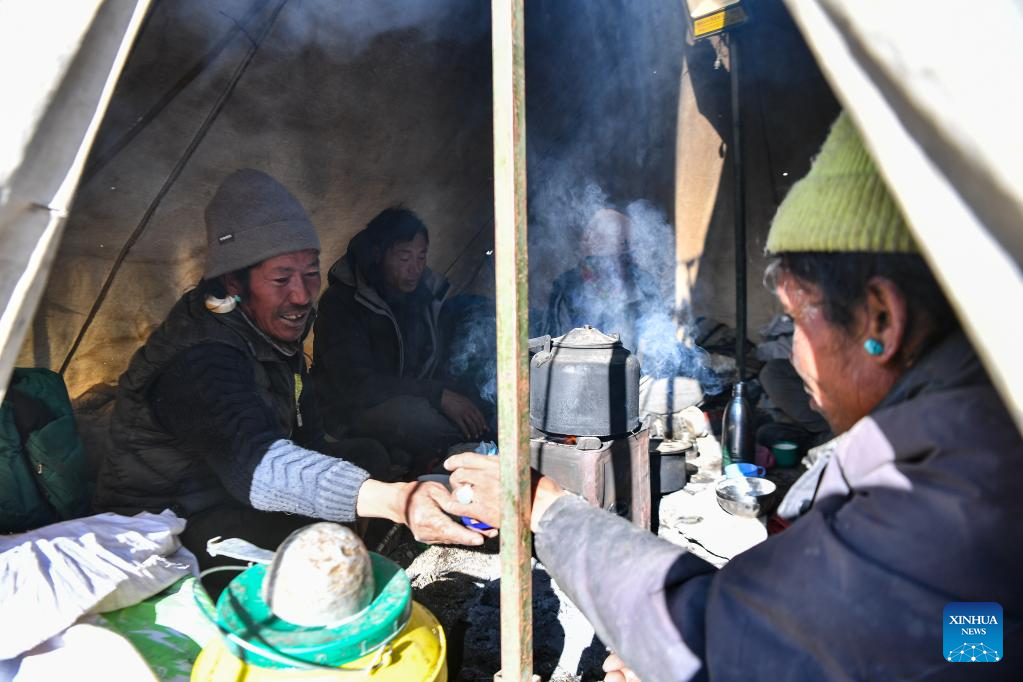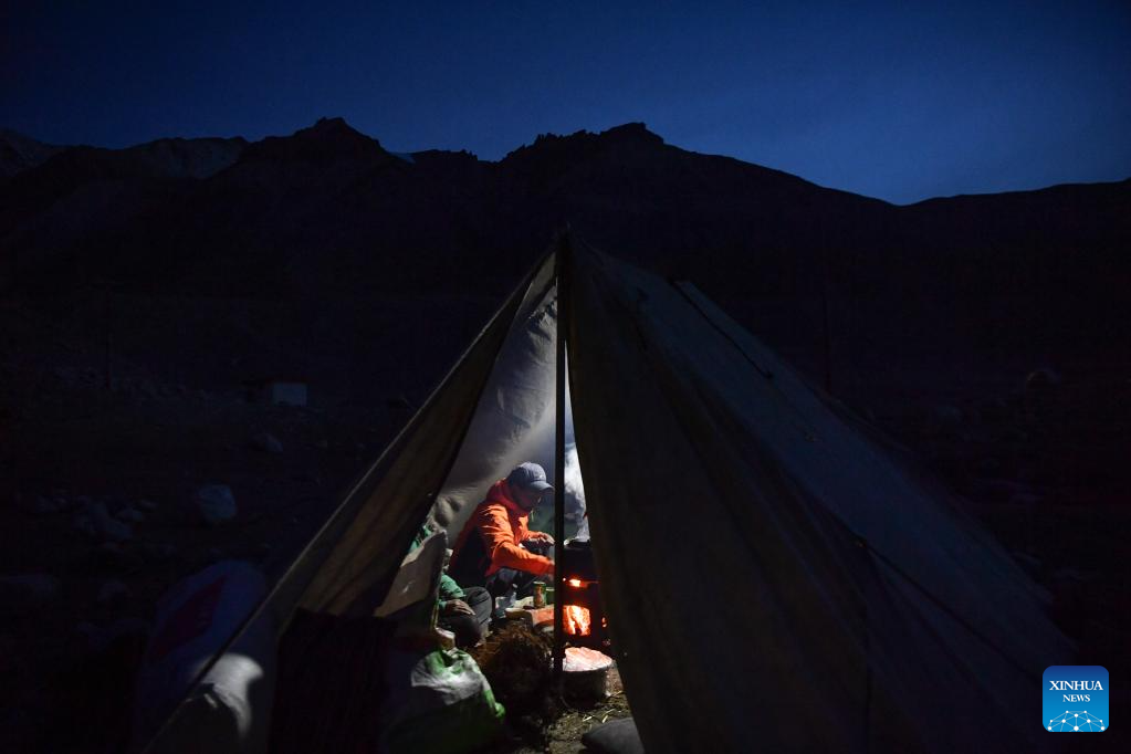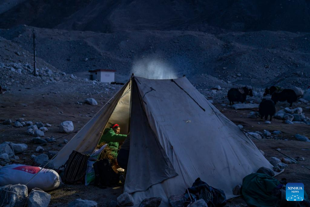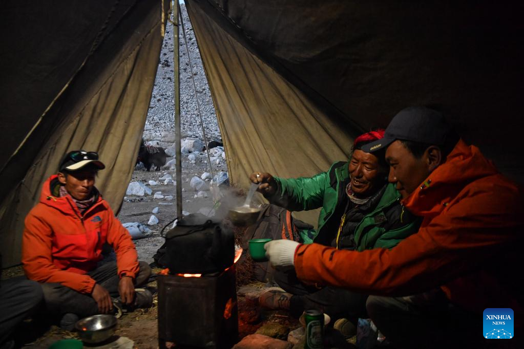 Herdsmen make tea at a tent near the Mount Qomolangma base camp in southwest China's Tibet Autonomous Region, May 17, 2023. (Xinhua/Jigme Dorje)