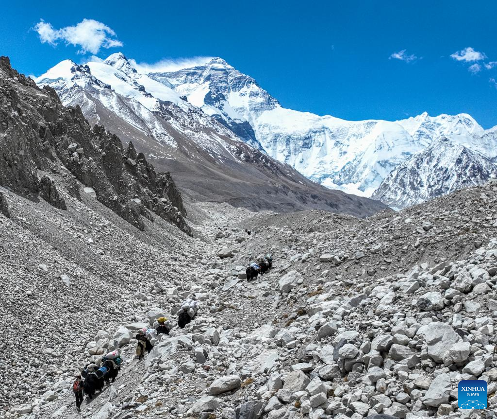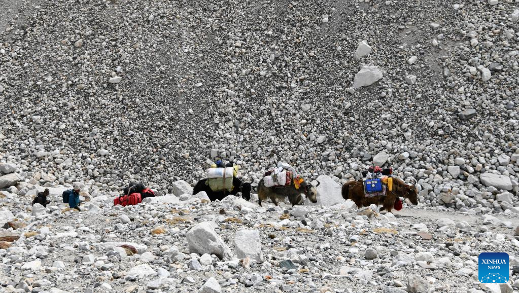 A yak caravan heads for the advance camp at an altitude of 6,500 meters on Mount Qomolangma in southwest China's Tibet Autonomous Region, May 12, 2023. (Xinhua/Jigme Dorje)