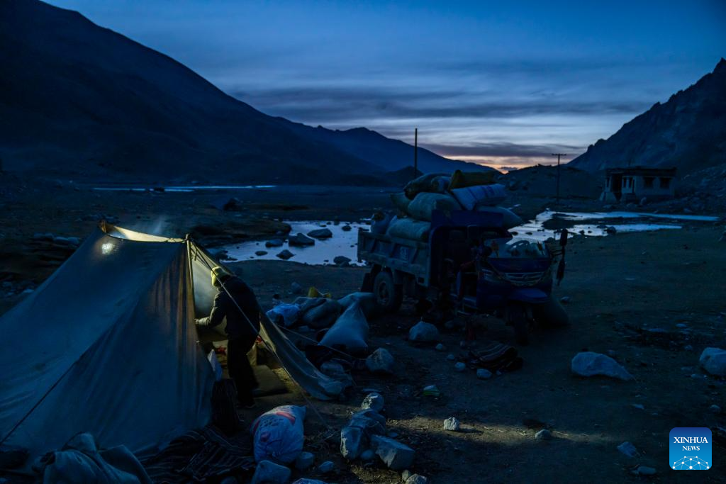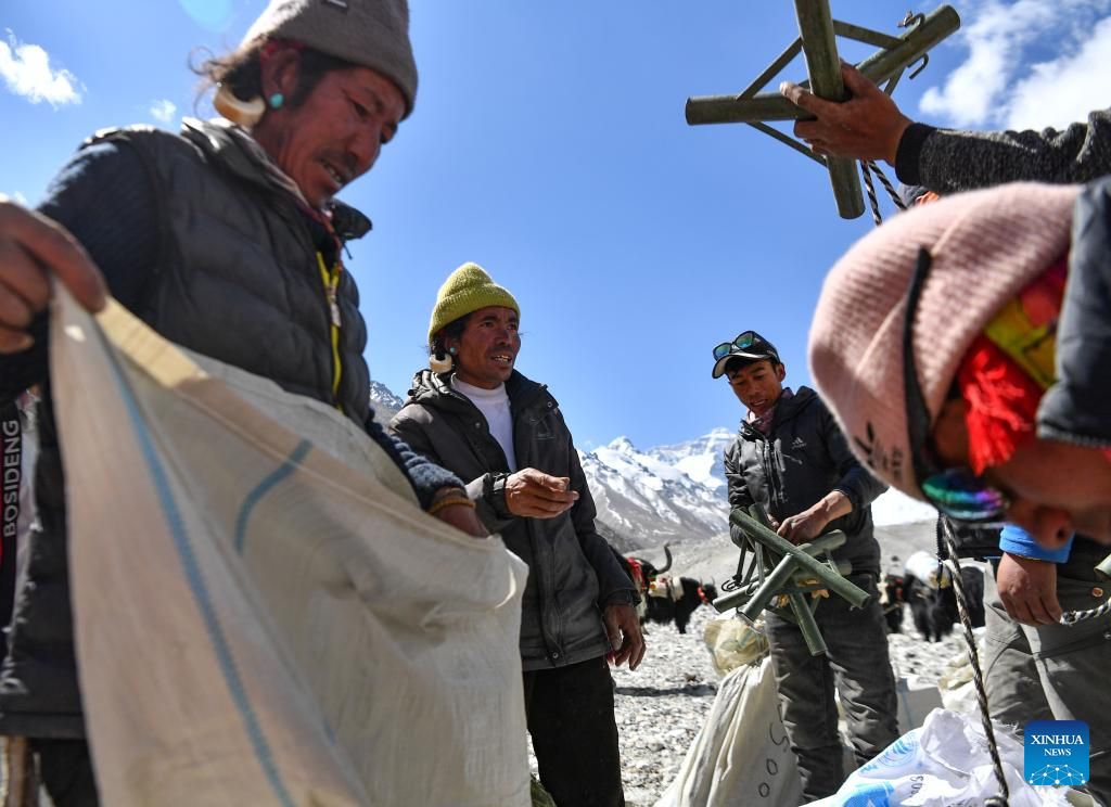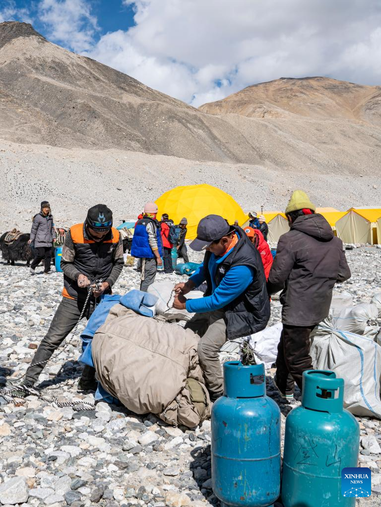 Herdsmen tie up the goods at the Mount Qomolangma base camp in southwest China's Tibet Autonomous Region, May 18, 2023. (Xinhua/Sun Fei)