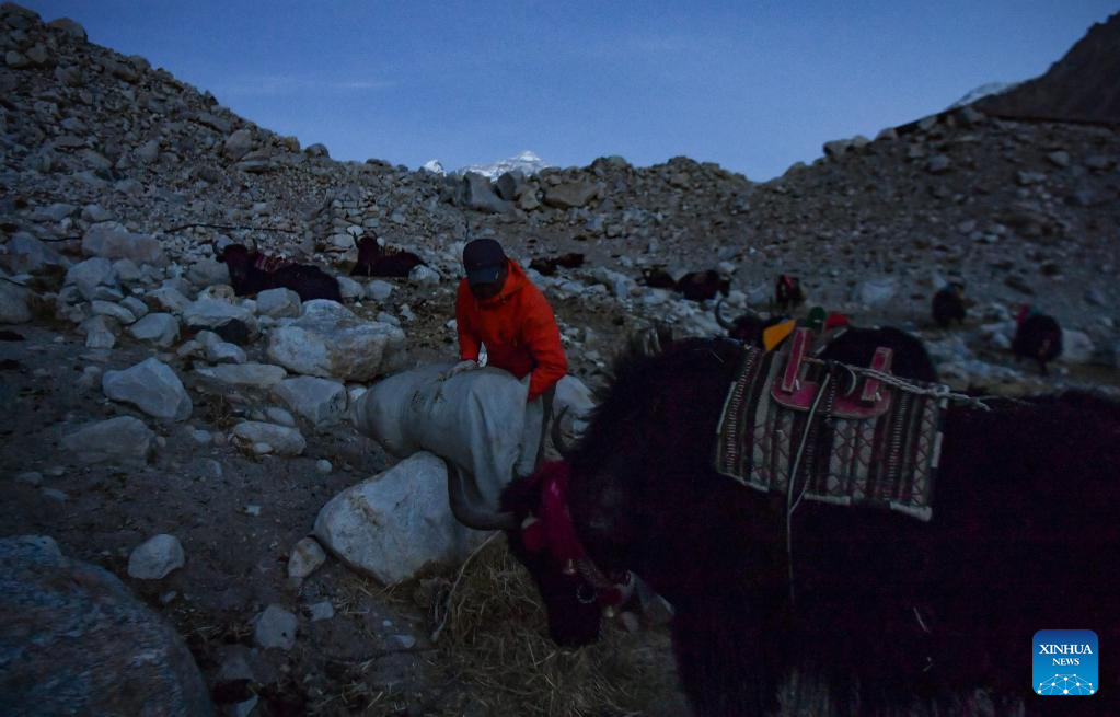 Herdsmen pack the goods for yak conveyance at the Mount Qomolangma base camp in southwest China's Tibet Autonomous Region, May 18, 2023. (Xinhua/Jigme Dorje)