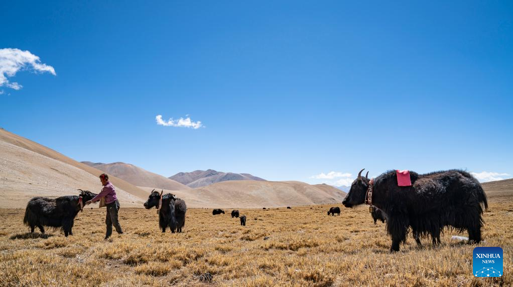A herdsman feeds yaks in Zangpu Village of Zhaxizom Township, Tingri County, Xigaze City, southwest China's Tibet Autonomous Region, May 20, 2023. (Xinhua/Sun Fei)