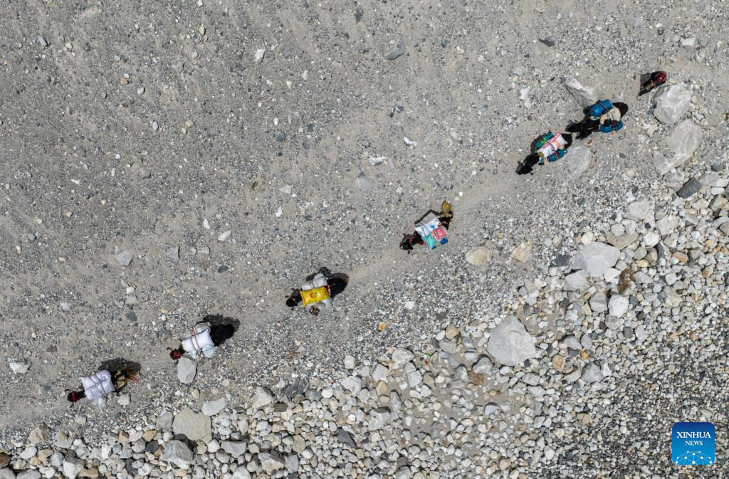 This aerial photo taken on May 18, 2023 shows a yak caravan heading for the advance camp at an altitude of 6,500 meters on Mount Qomolangma in southwest China's Tibet Autonomous Region. (Xinhua/Sun Fei)