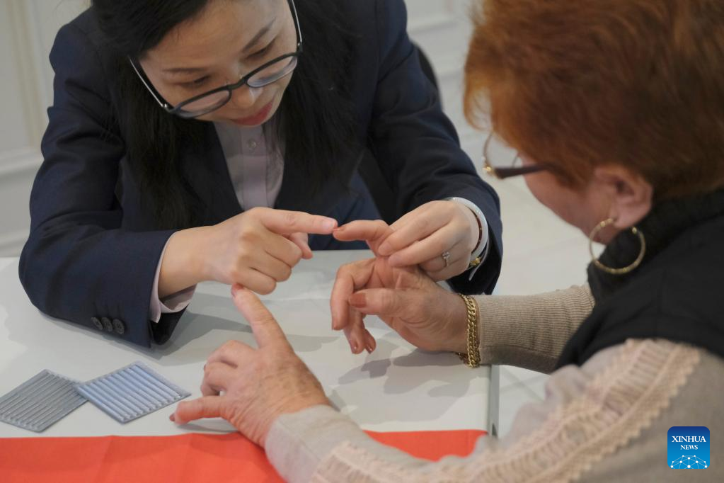 Shi Xinying (R), member of the 18th Chinese medical team for Malta, gives a lecture on traditional Chinese medicine (TCM) treatment in Paola, Malta, on May 22, 2023. (Photo by Jonathan Borg/Xinhua)