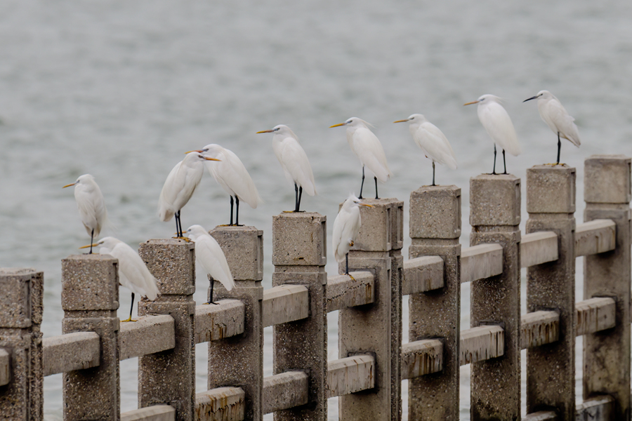 Chinese egrets rest on guardrails in Xiang'an district, Xiamen city, southeast China's Fujian Province. (Photo/Chen Hao)