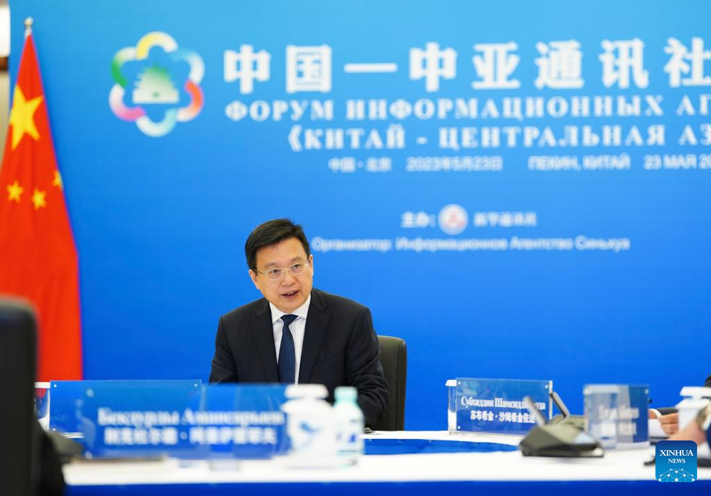 Fu Hua, president of Xinhua News Agency, delivers a speech while presiding over the China-Central Asia News Agency Forum, in Beijing, capital of China, May 23, 2023. A forum on strengthening collaboration among media outlets in China and Central Asian countries was held in Beijing on Tuesday. The China-Central Asia News Agency Forum, themed on "boosting media cooperation to promote the building of a China-Central Asia community with a shared future," was one of the achievements of the recently concluded China-Central Asia Summit. The forum was initiated and hosted by China's Xinhua News Agency and attended by heads and representatives of media outlets from five Central Asian countries, namely, the Television and Radio Complex of the President of the Republic of Kazakhstan, Kabar News Agency of Kyrgyzstan, Khovar News Agency of Tajikistan, Media Turkmen News Agency and Uzbekistan National News Agency. During the forum, a consensus was reached among media outlets in China and the five Central Asian countries to strengthen and expand cooperation further, aiming to elevate its scope and explore additional avenues of collaboration. (Xinhua/Chen Yehua)