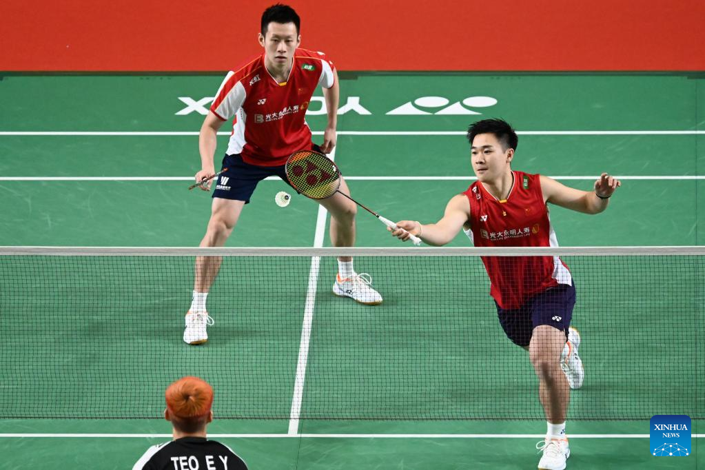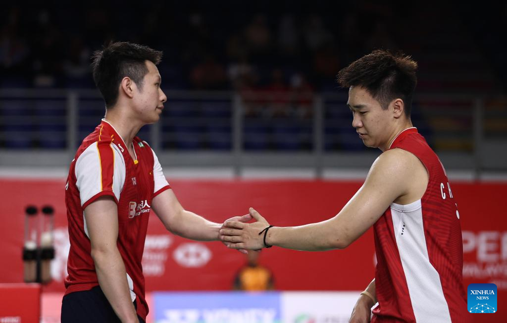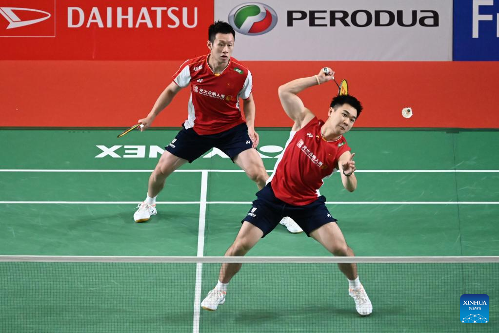 China's Ren Xiangyu/Tan Qiang (R) compete during the men's doubles round of 32 match against Malaysia's Ong Yew Sin/Teo Ee Yi at Malaysia Masters 2023 in Kuala Lumpur, Malaysia, May 23, 2023. (Photo by Leong Huey Mun/Xinhua)
