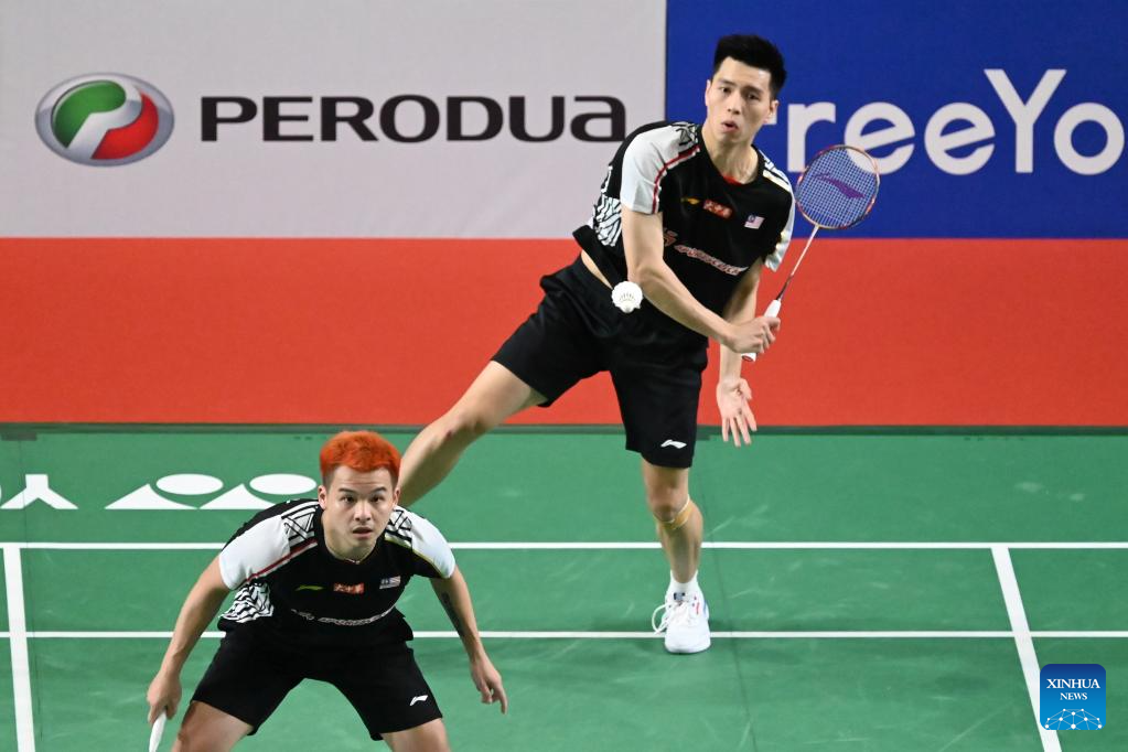Malaysia's Ong Yew Sin/ Teo Ee Yi (L) compete during the men's doubles round of 32 match against China's Ren Xiangyu/Tan Qiang at Malaysia Masters 2023 in Kuala Lumpur, Malaysia, May 23, 2023. (Photo by Leong Huey Mun/Xinhua)